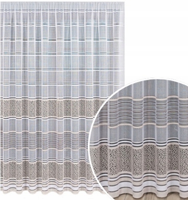 Firana wykonana z żakardu,zdobiona białymi i beżowymi poziomymi pasami.