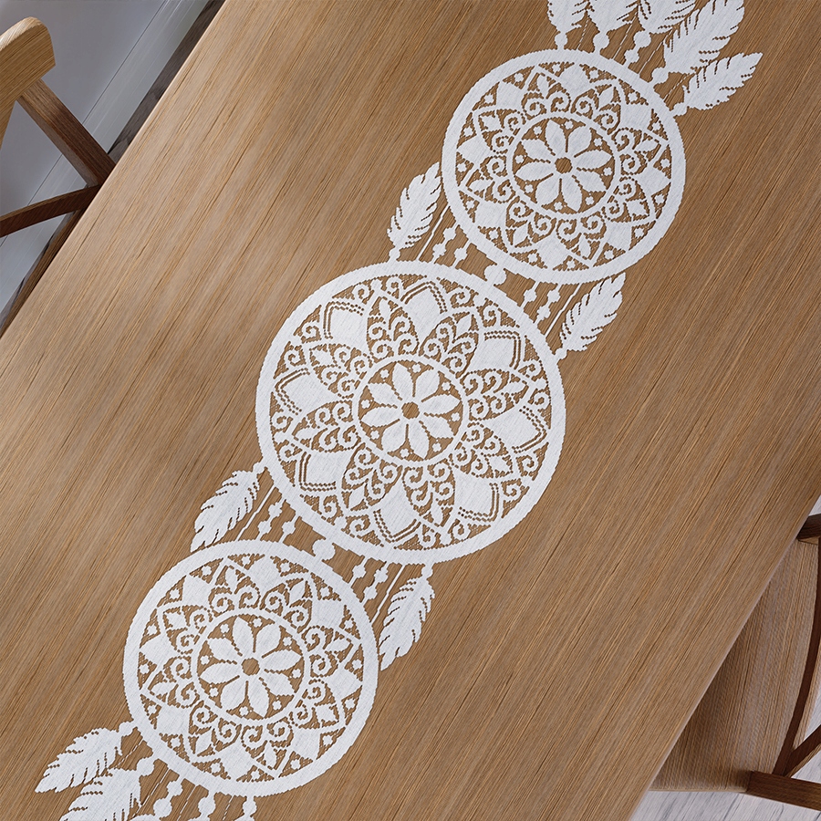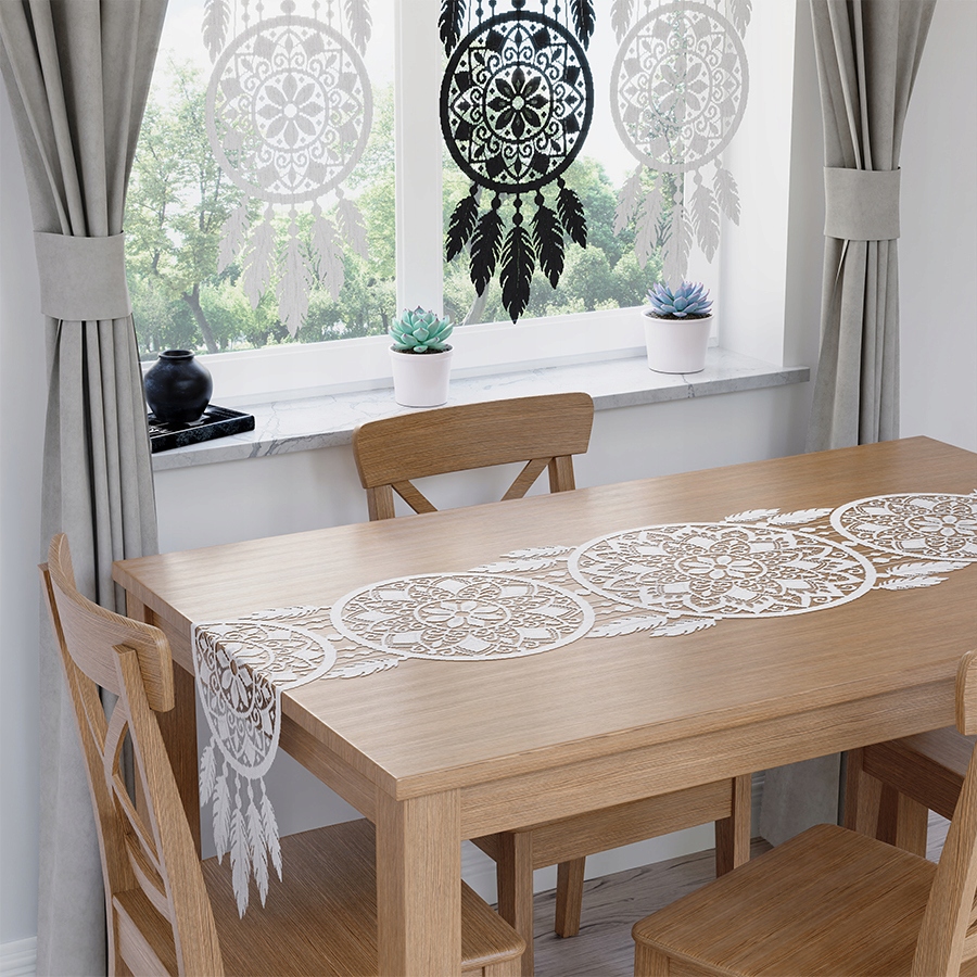 Bieżnik żakardowy ŁAPACZ SNÓW został wykonany z wysokiej jakości materiału, który charakteryzuje się trwałością oraz łatwością w utrzymaniu. Dodatkowo bieżniki żakardowe to nowość na rynku, dzięki którym Twoje wnętrze nabierze nowoczesnego akcentu. Wzór łapacza snów w połączeniu z formą bieżnika świetnie pasuje zarówno do wnętrz nowoczesnych jak i tych w stylu klasycznym.