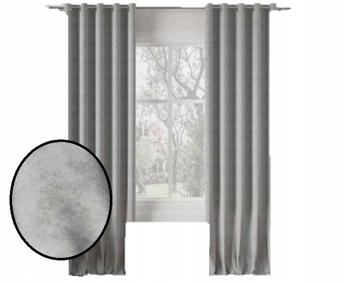 Zasłona wykonana z grubego materiału w kolorze jasnoszarym.