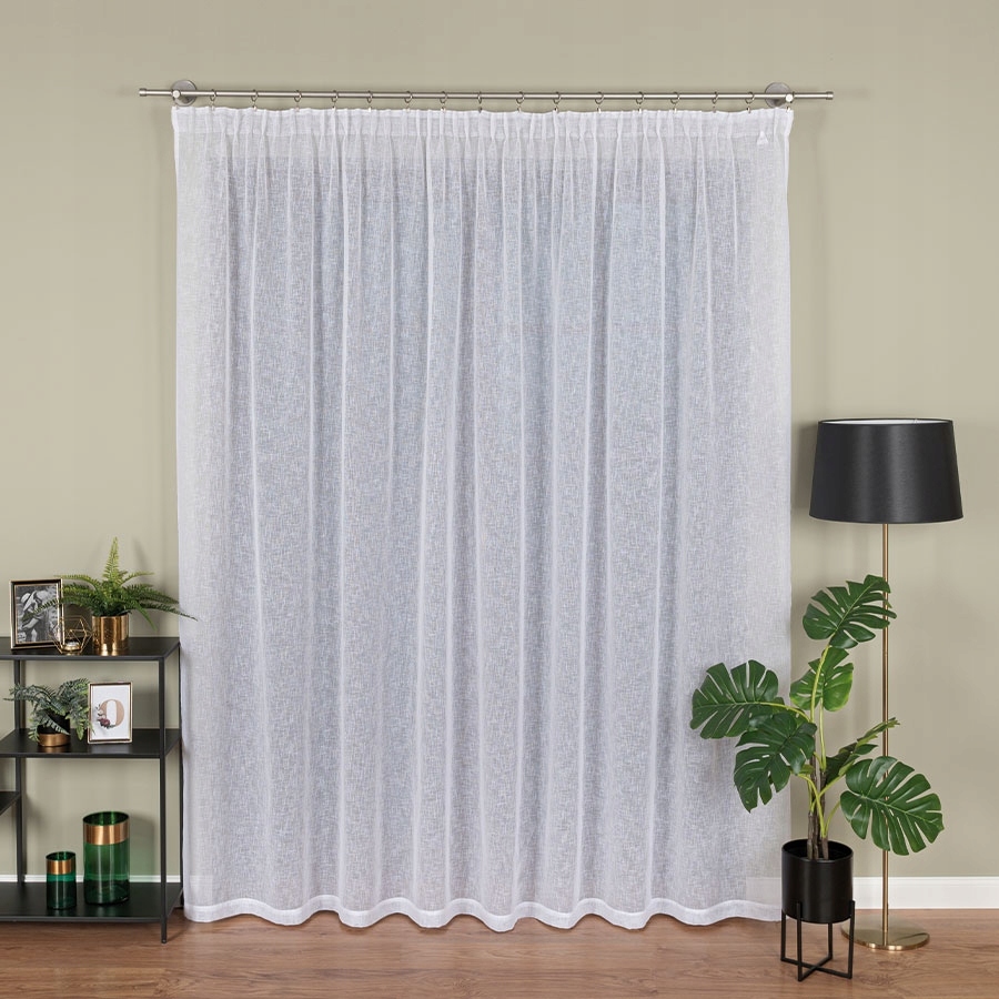 Firanka z etaminy wykonana na klasycznej taśmie marszczącej, świetnie sprawdzi się we wszystkich pomieszczeniach. W szczególności w salonie na dużym oknie balkonowym. Śnieżnobiały kolor wprowadzi do wnętrza świeżość i będzie idealnym akcentem dla mocniejszych kolorów. Struktura przypominająca len nadaje jej naturalny wygląd. Niezależnie od tego, czy preferujesz nowoczesne, minimalistyczne wnętrza, czy bardziej klasyczne aranżacje, firanka o strukturze lnu będzie idealnym uzupełnieniem Twojej aranżacji.