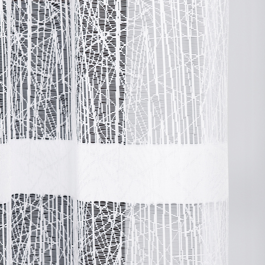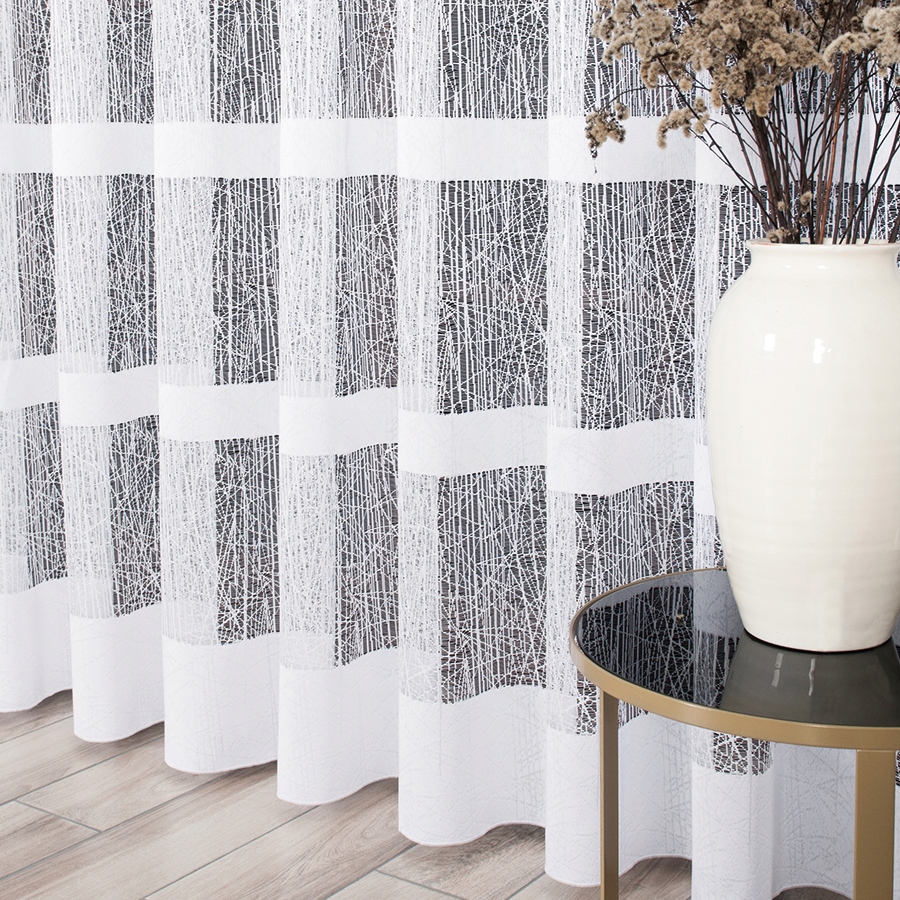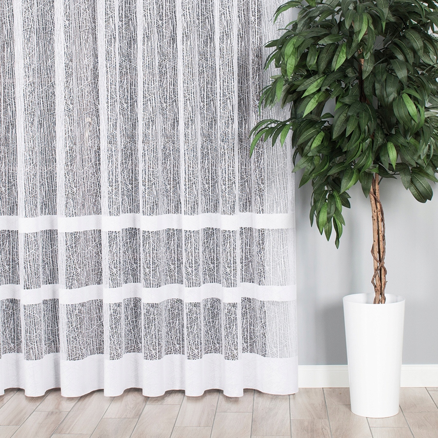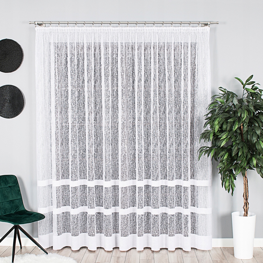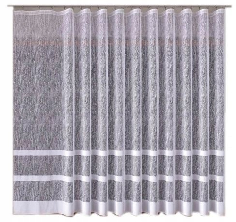 Firana gotowa do zawieszenia. Posiada wszytą taśmę marszczącą oraz obszyte boki.