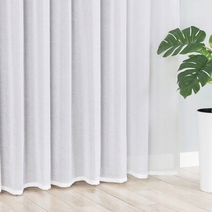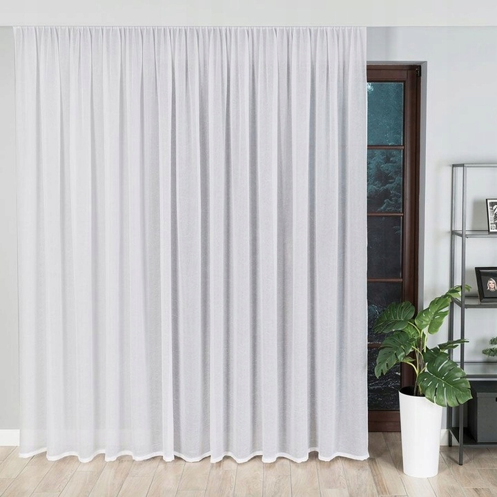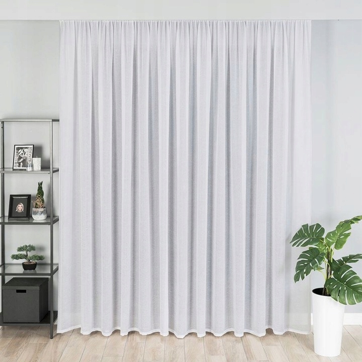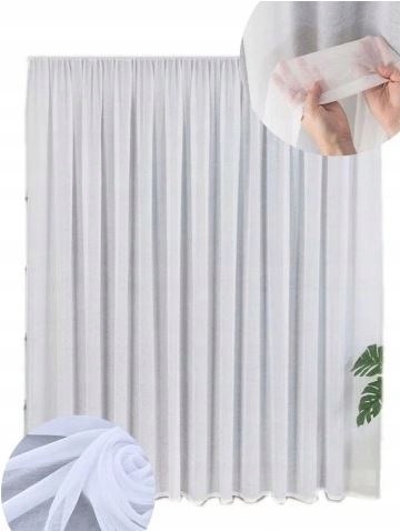 Firana jest obszyta oraz z taśmą marszczącą.
