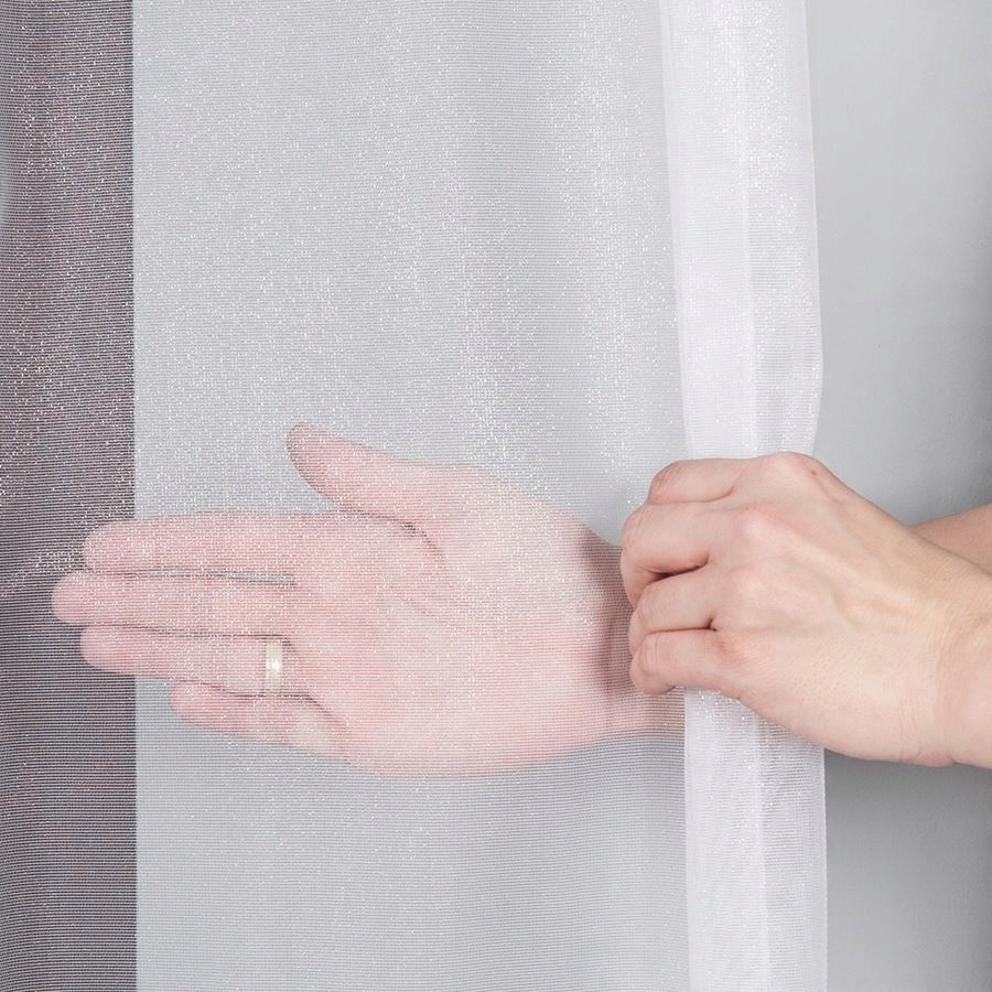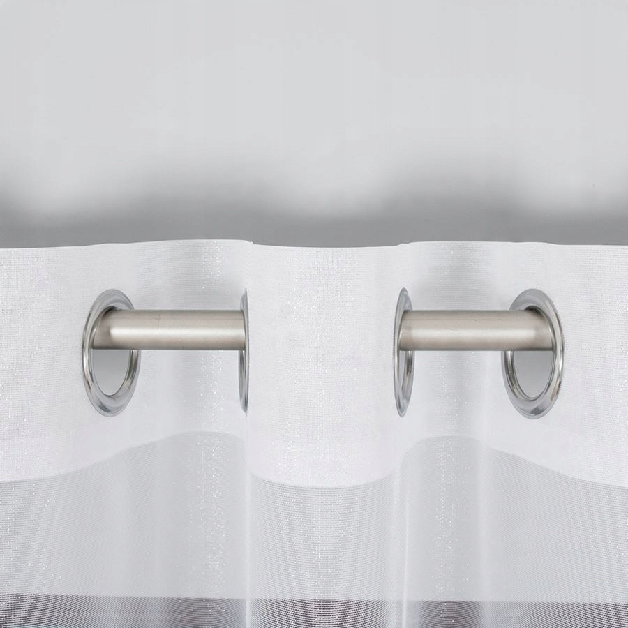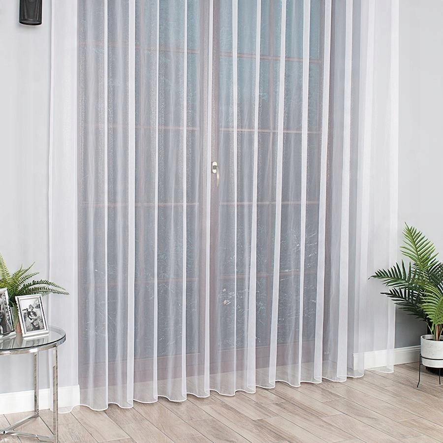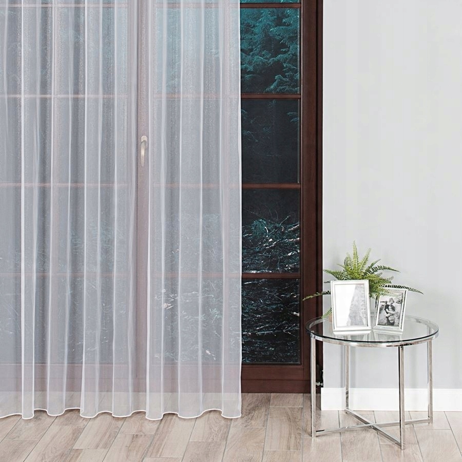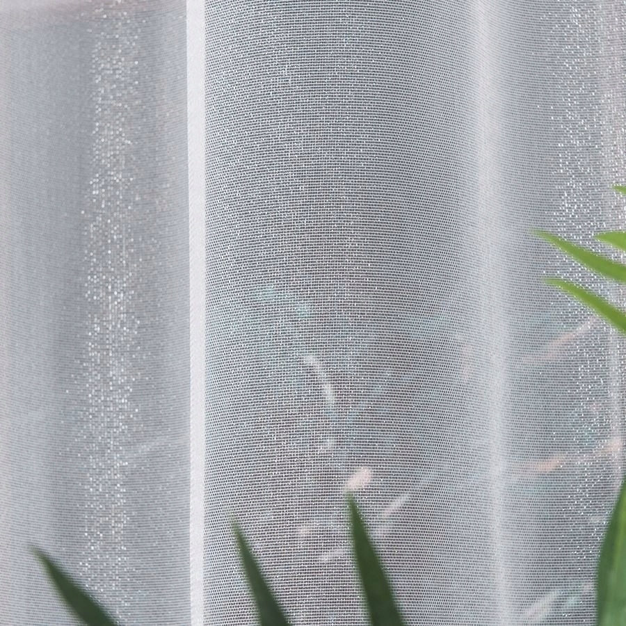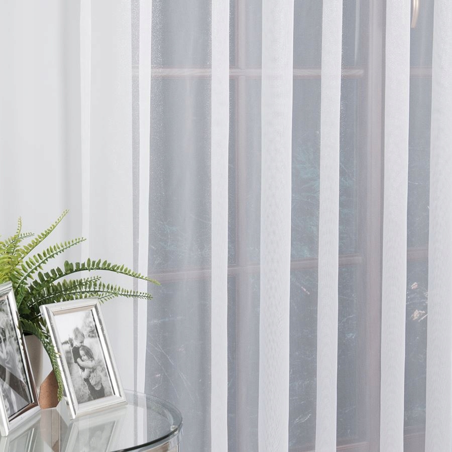 Efektowna i elegancka firana uszyta na przelotkach Firana jest wykonana z nabłyszczanej przędzy dzięki czemu pięknie wygląda w świetle słonecznym. Daje efekt mieniących się kryształków. Jest delikatna i subtelna, dlatego będzie idealnie kontrastować z barwnym i wzorzystym wystrojem wnętrz. Firana ma obszyte boki, u góry posiada metalowe przelotki, dzięki czemu jest łatwa w montażu. Kolor biały nie szarzeje nawet po wielu praniach. Jest możliwość uszycia jej na dowolny wymiar.