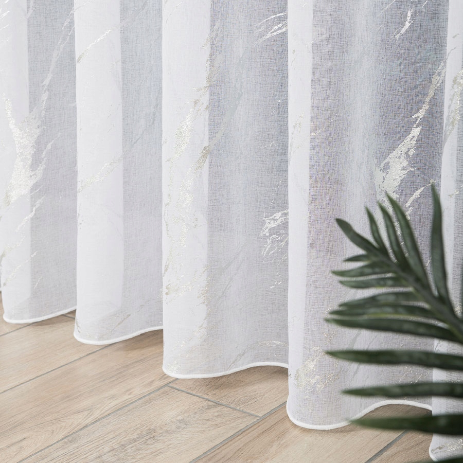 - Wyjątkowy Wzór: Dekoracyjny srebrny wzór marmuru nadaje tej firanie niezwykłego charakteru. To efektowna dekoracja, która przyciąga uwagę i dodaje blasku każdemu wnętrzu.