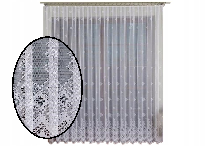 Firana wykonana z grubo tkanej białej siateczki żakardowej zdobiona po całości wzorkiem w romby.