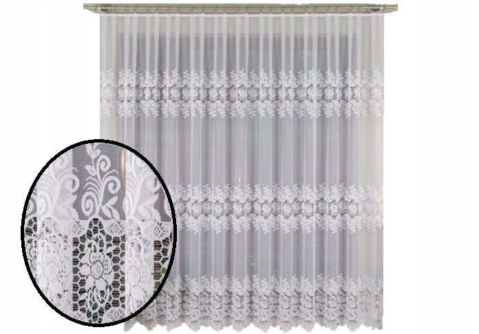 Firana wykonana z białej siateczki żakardowej zdobiona 3 pasami wzorów z motywem kwiatowym.