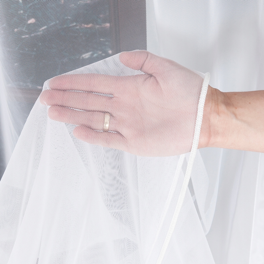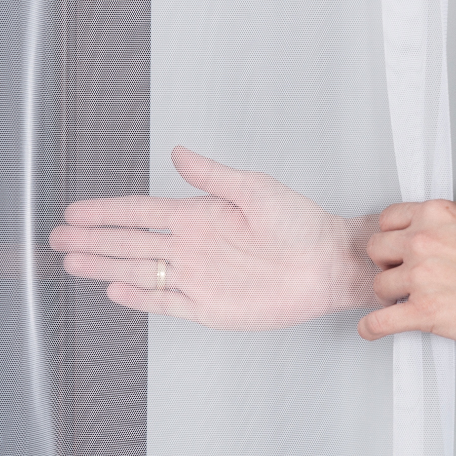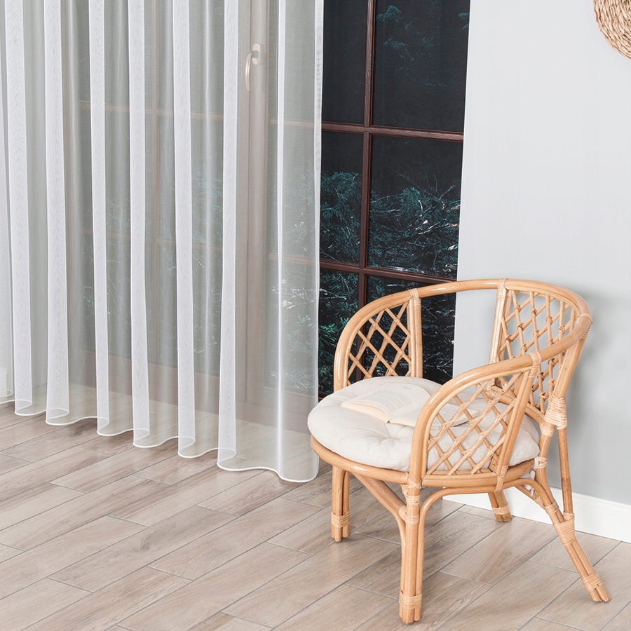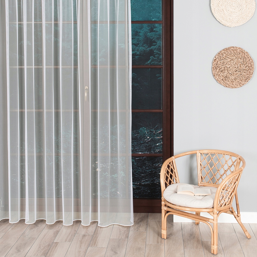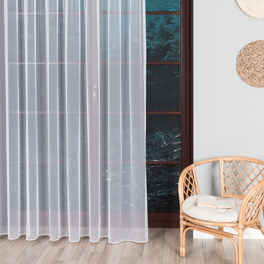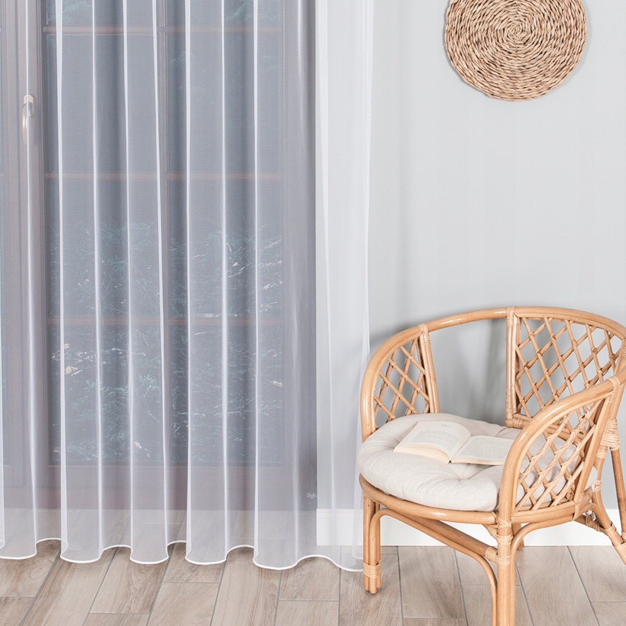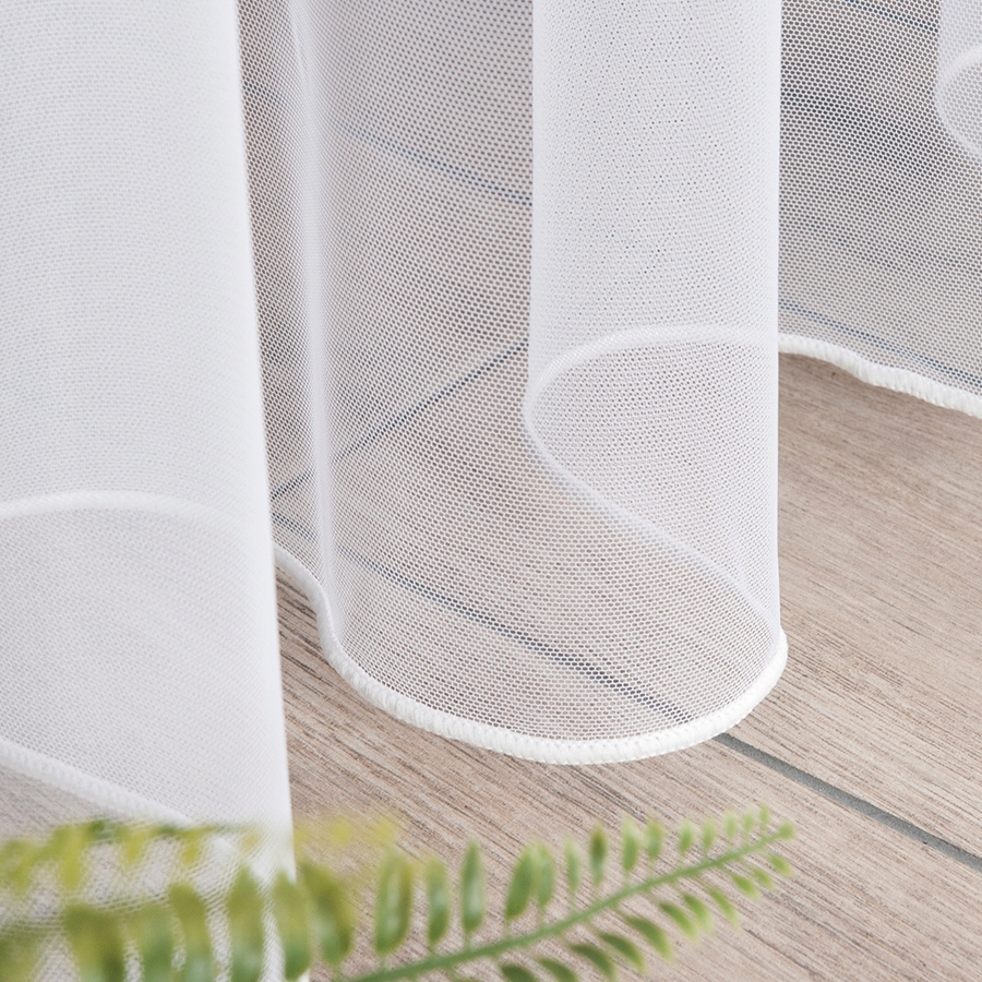 Firana z cienkiego tiulu w kolorze białym i kremowym. Materiał jest delikatny, lekki i bardzo przejrzysty, dzięki czemu nie zatrzymuje światła. Miękka w dotyku delikatna jak mgiełka. Idealnie się układa na oknie.