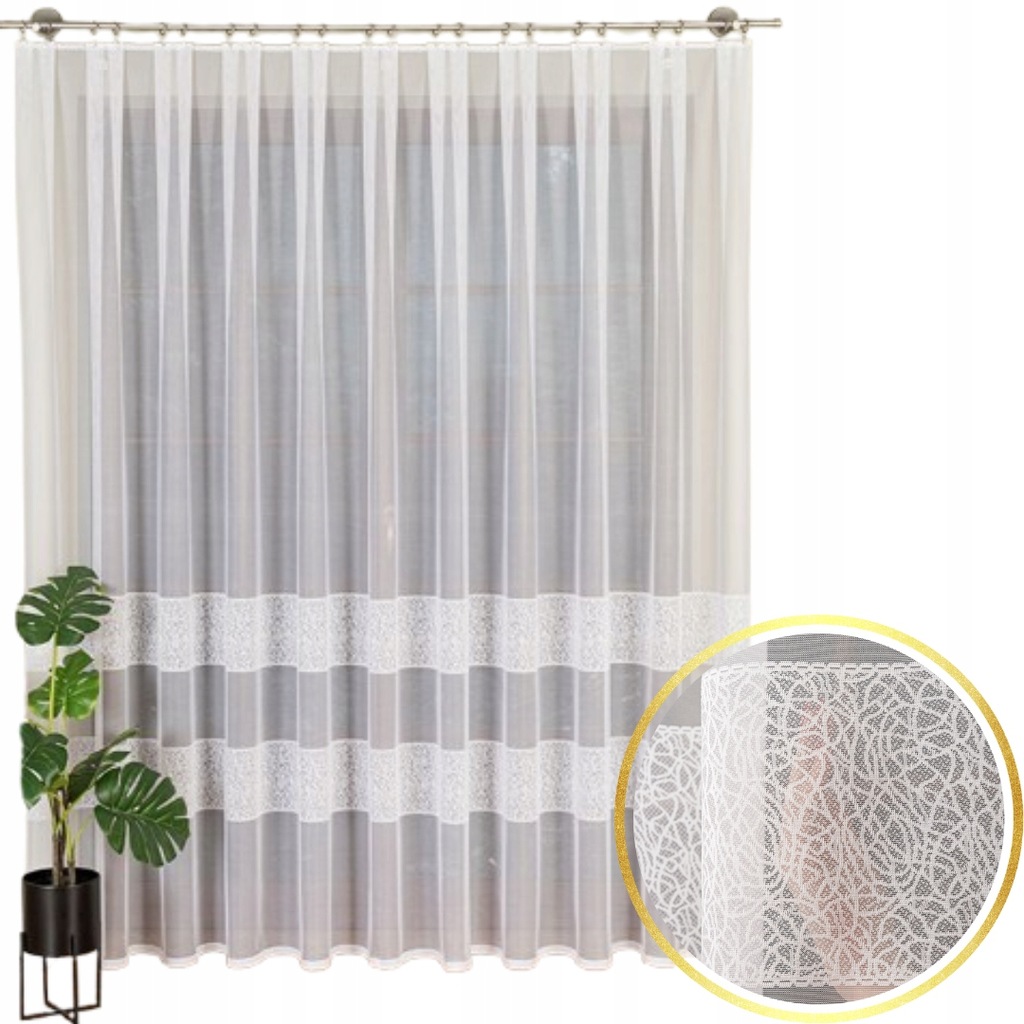 Firana wykonana z tkanej białej siateczki żakardowej zdobiona pasami.
