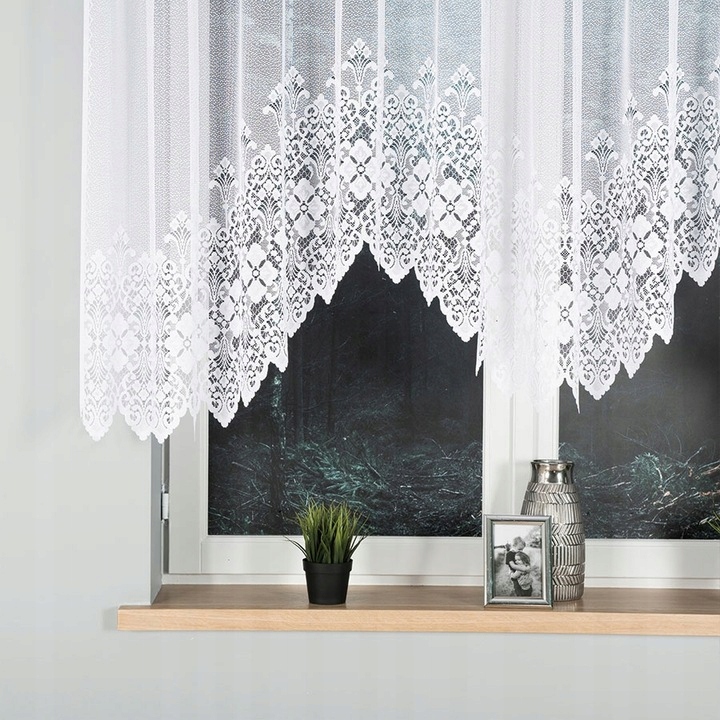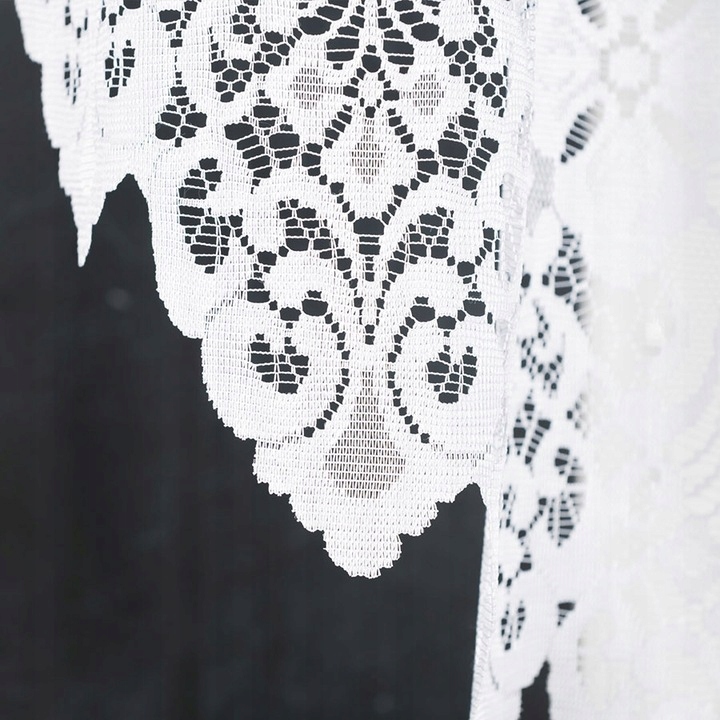 Wykonana z klasycznej żakardowej przędzy tkanina w klasycznym białym kolorze. Bogaty dekoracyjny wzór pięknie zdobi firanę na większości jej powierzchni.