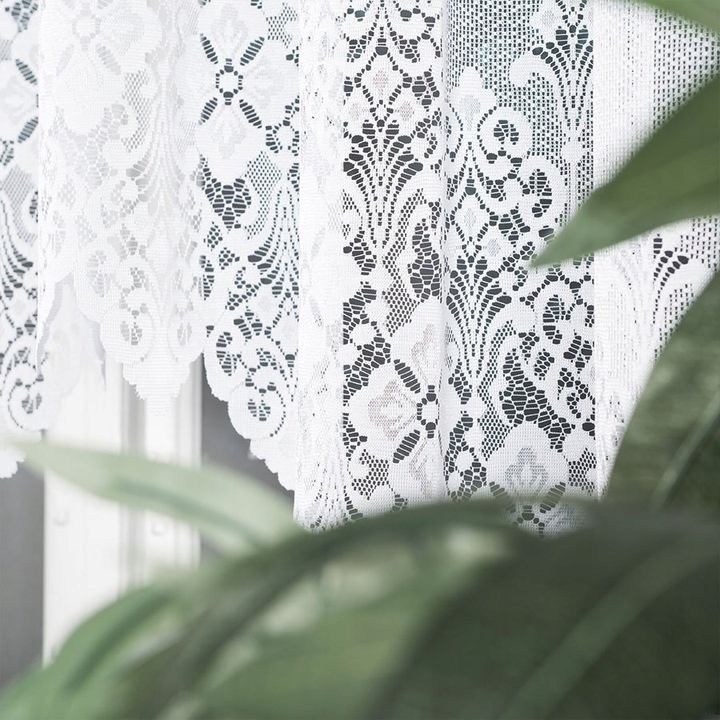 Firanka wykonana jest z najwyższej jakości przędzy matowej, która nadaje jej elegancki i wysmakowany wygląd. Dekoracyjny wzór kwiatowy na białym tle dodaje jej uroku i lekkości, idealnie komponując się z różnymi stylami aranżacji wnętrz.
