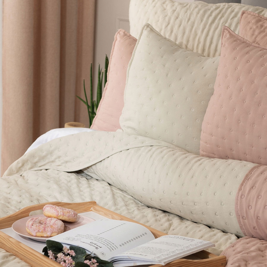 Narzuta to nie tylko praktyczny dodatek, ale również wspaniały walor dekoracyjny, dzięki któremu stworzysz sypialnię pełną harmonii, w której przyjemnie będziesz spędzać czas. Lekka i miękka w dotyku narzuta na łóżko w pastelowym kolorze, to wspaniały dodatek, za pomocą którego odmienisz swoją sypialnię w kilka minut. Górna część została ozdobiona dekoracyjnym tłoczonym wzorem małych kółek, które dodają lekkości i romantycznego charakteru. Wzór ten został wykonany metodą hot press, całość wykończona spodem z mikrofibry. Przyjemna dla oka kolorystyka tkaniny wprowadzi do wnętrza ciepło i harmonię. Idealna do wnętrz urządzonych w stylu nowoczesnym, glamour czy romantycznym.