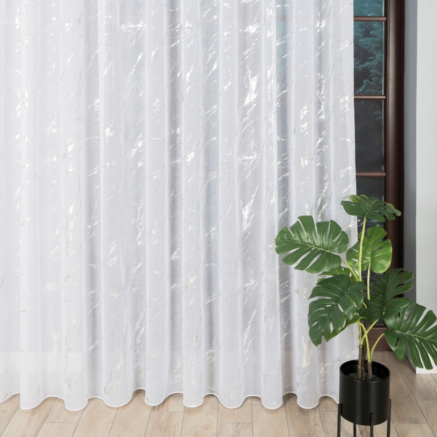 - Wyjątkowy Wzór: Dekoracyjny srebrny wzór marmuru nadaje tej firanie niezwykłego charakteru. To efektowna dekoracja, która przyciąga uwagę i dodaje blasku każdemu wnętrzu.