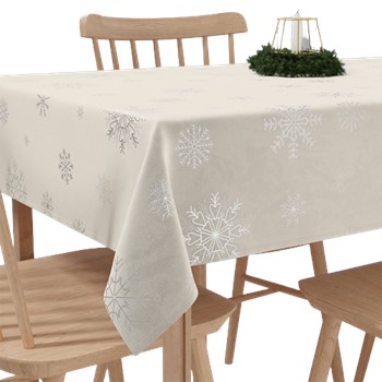 Rozmiar 140x220 cm tego obrusu sprawia, że doskonale pasuje do większych stołów, tworząc elegancką i urokliwą atmosferę. Wykonany jest z miękkiej, przyjemnej w dotyku tkaniny welwetowej o kolorze offwhite, która nadaje mu subtelnego blasku i wyjątkowego charakteru. Wzór w postaci srebrnych śnieżynek nadaje mu świątecznego uroku, idealnie wpisując się w atmosferę magicznych świąt.